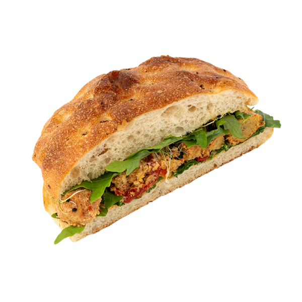 Unser Focaccia Dinkel-Gemüsetartar ist gefüllt mit würzigem Gemüsetartar (Ayvar-Dinkel) Rucola, Tomaten und Zwiebelsprossen.