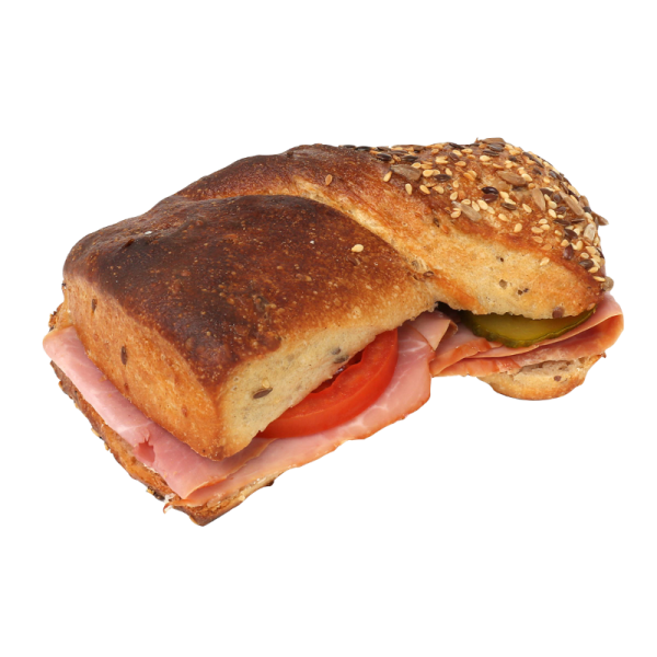 Unser Chnurzellandbrötli gefüllt mit Butter, Lolosalat, Trutenschinken, Salatgurken und Tomaten.
