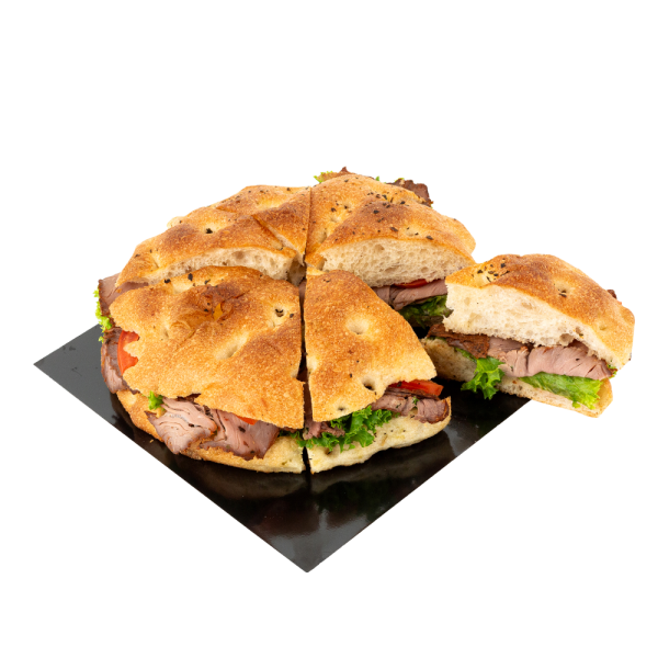 Unser Apèro Focaccia Roastbeef ist gefüllt mit zartem Roastbeef (CH), Tartarsauce, Lolosalat und Tomaten. Gewürzt mit frischem Pfeffer aus der Mühle.