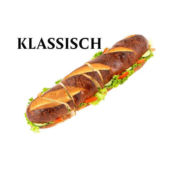 Unser Laugenbaguette aus feinem Kuhn-Zopfteig. Belegt mit Hartkäse, Schinken, Salami, Fleischkäse, Lolosalat, Salatgurken, Tomaten und Butter.