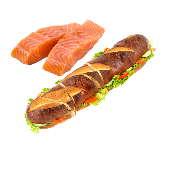 Unser Laugenbaguette aus feinem Kuhn-Zopfteig. Belegt mit Rauchlachs, Lolosalat, Zwiebelringen, Kapern und Butter.