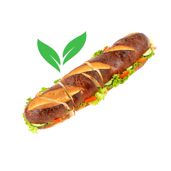 Unser Laugenbaguette aus feinem Kuhn-Zopfteig. Belegt mit Hartkäse, Brie, Eimasse, Lolosalat, Salatgurken, Tomaten und Butter.